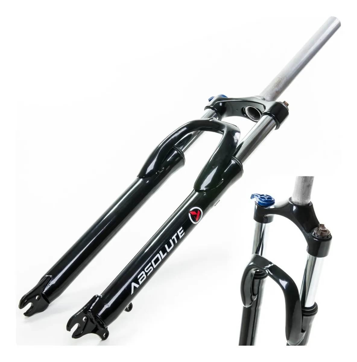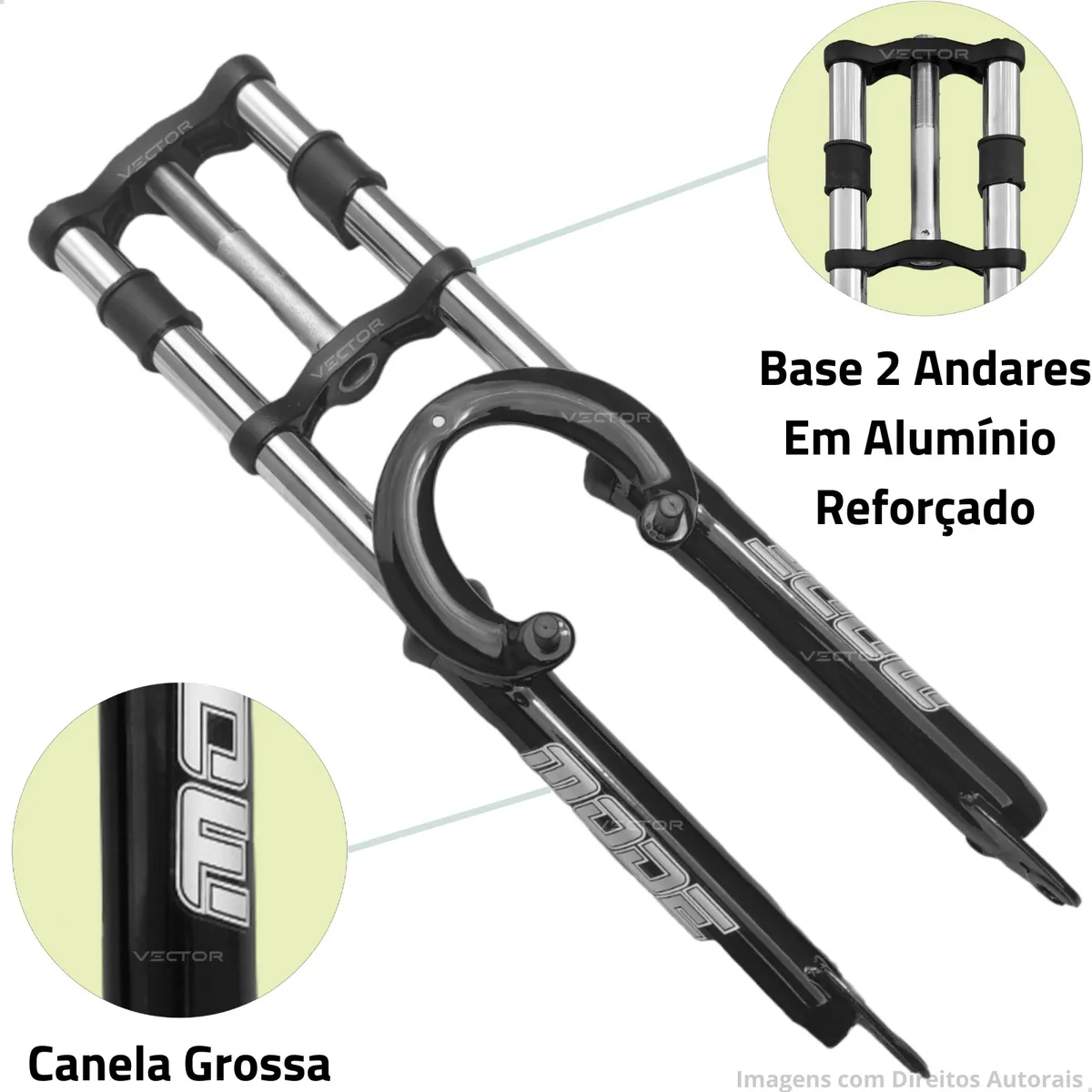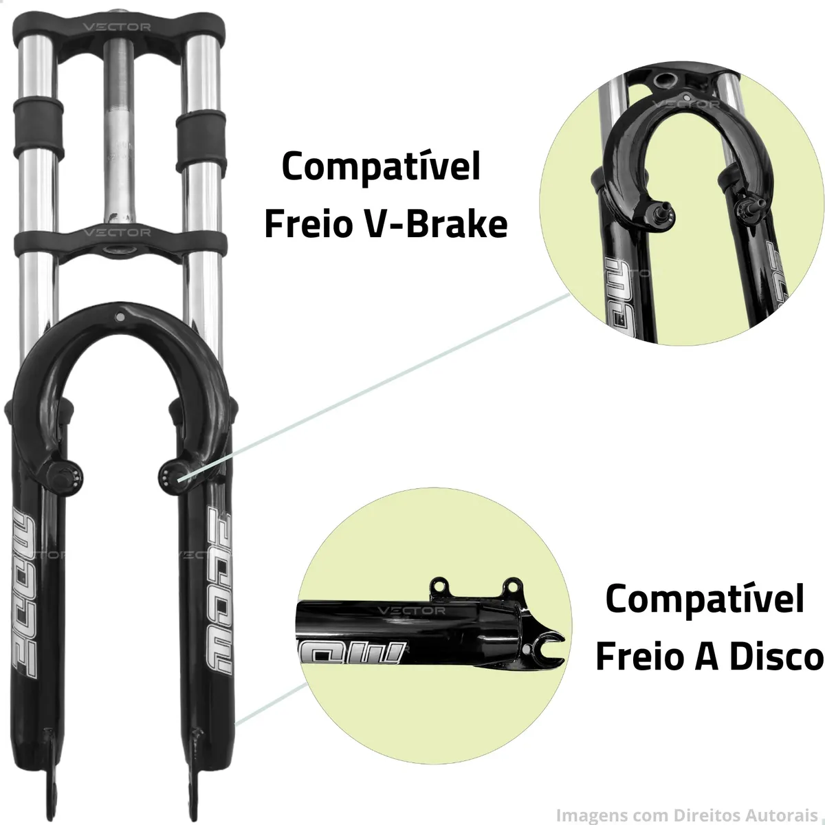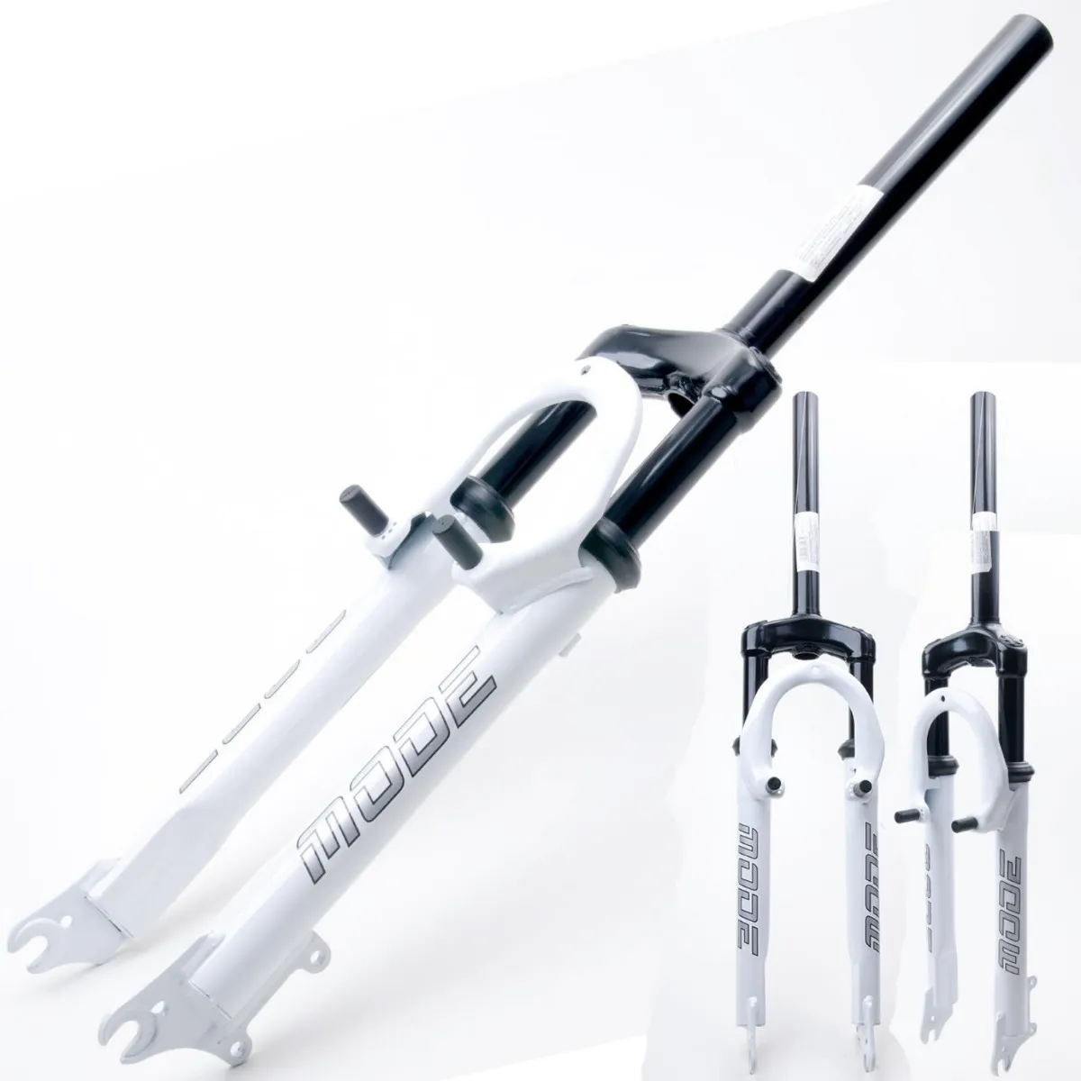 Suspensão de Bike MTB para aros 26′ com freio a disco ou v-brake. Compatível com caixa de direção standard 21,1mm interno com rosca. Suspensão Mode 711G Standard 21.1mm (com rosca). Excelente custo beneficio, boa para trilhas medias e iniciantes. Sistema de suspensão com molas, o que traz conforto, agilidade e eficiência na hora da prática esportiva! Esse modelo na cor branca é ideal para combinar com sua bike!